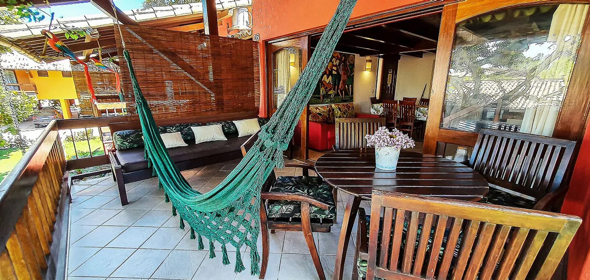 - Varanda vista jardim com rede, mesa, poltronas e sofà.