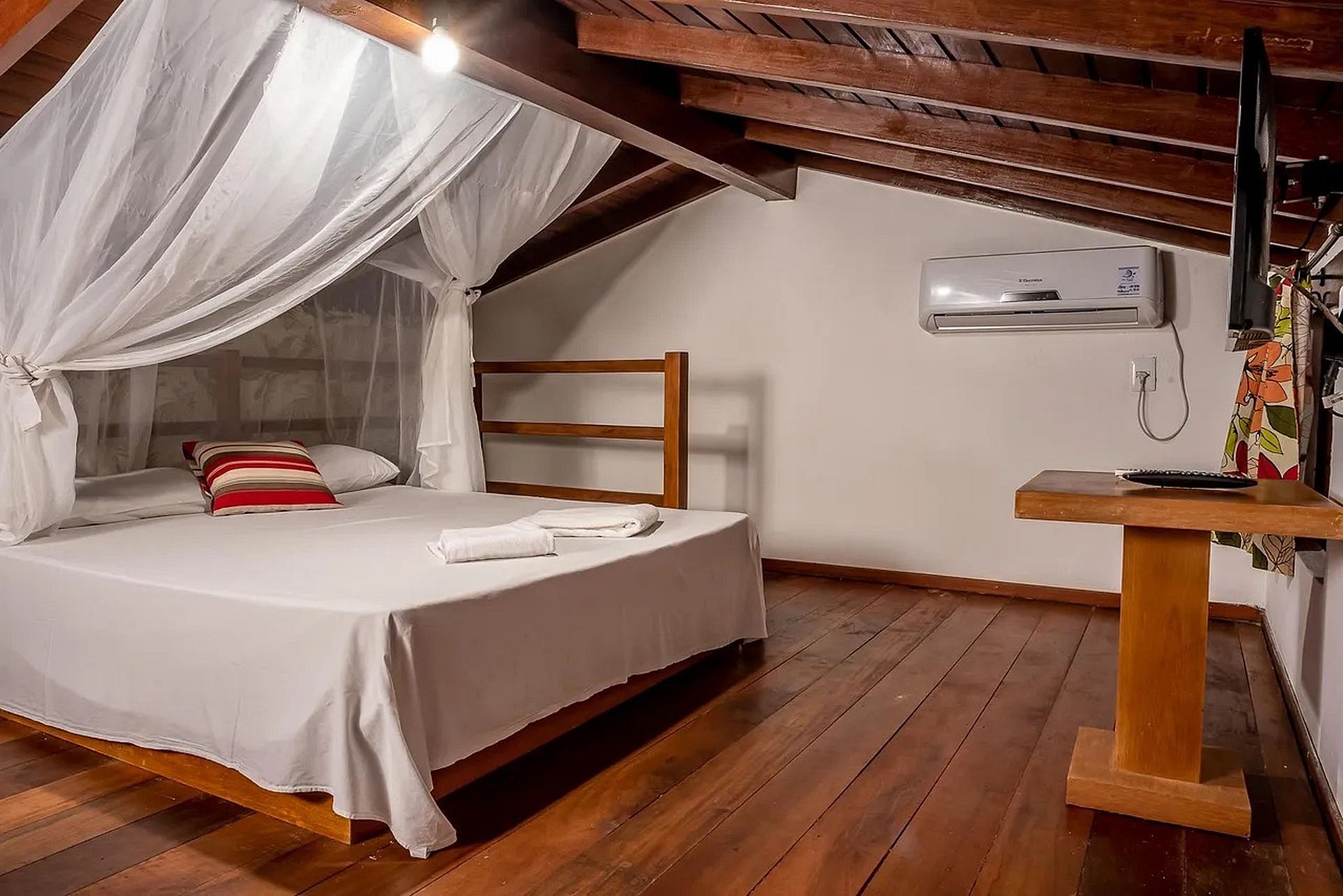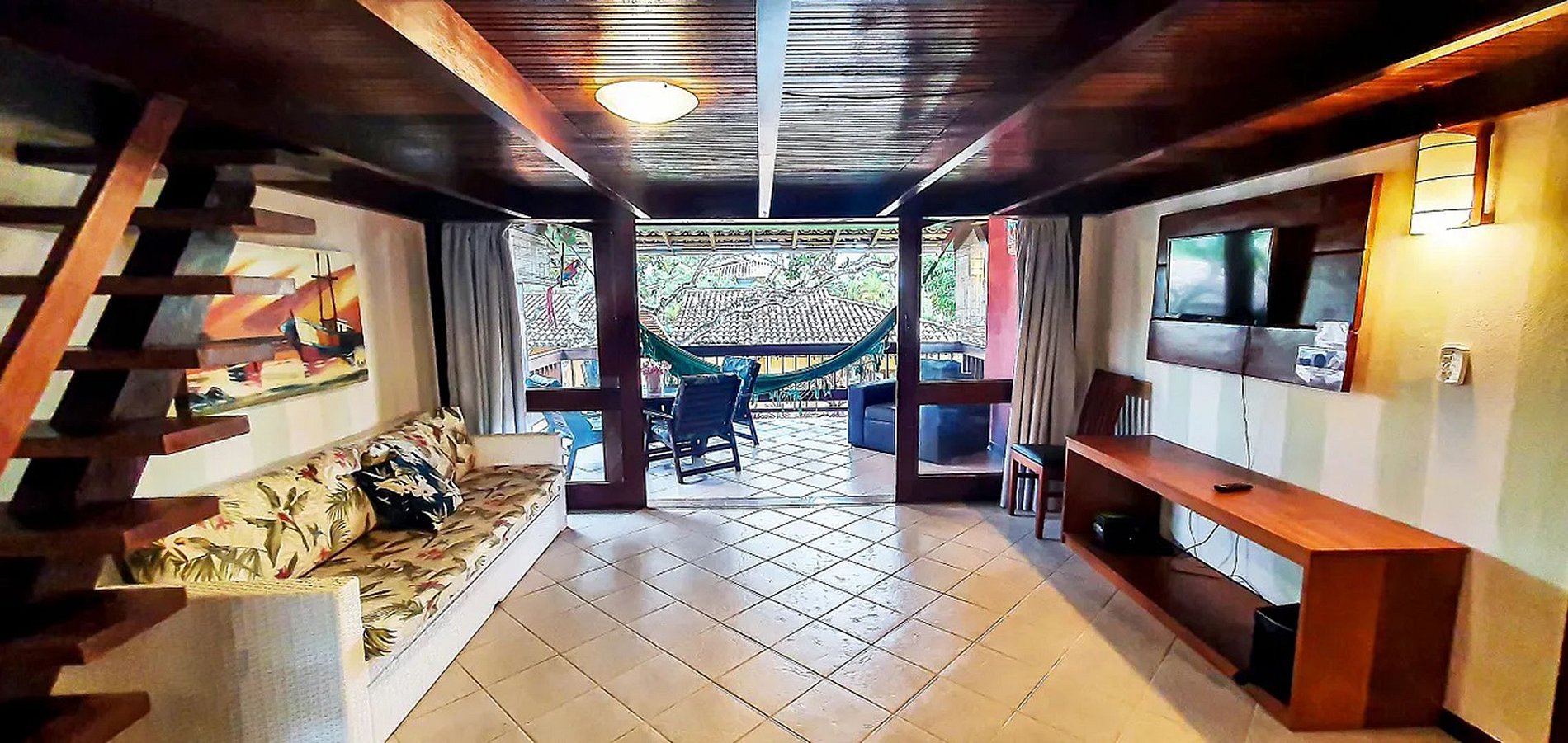 -Sala com TV, com sofà-cama de casal ou 2 camas de solteiro separadas, mais se preferir, um mezanino com TETO BAIXO com cama queen, ar split e TV.