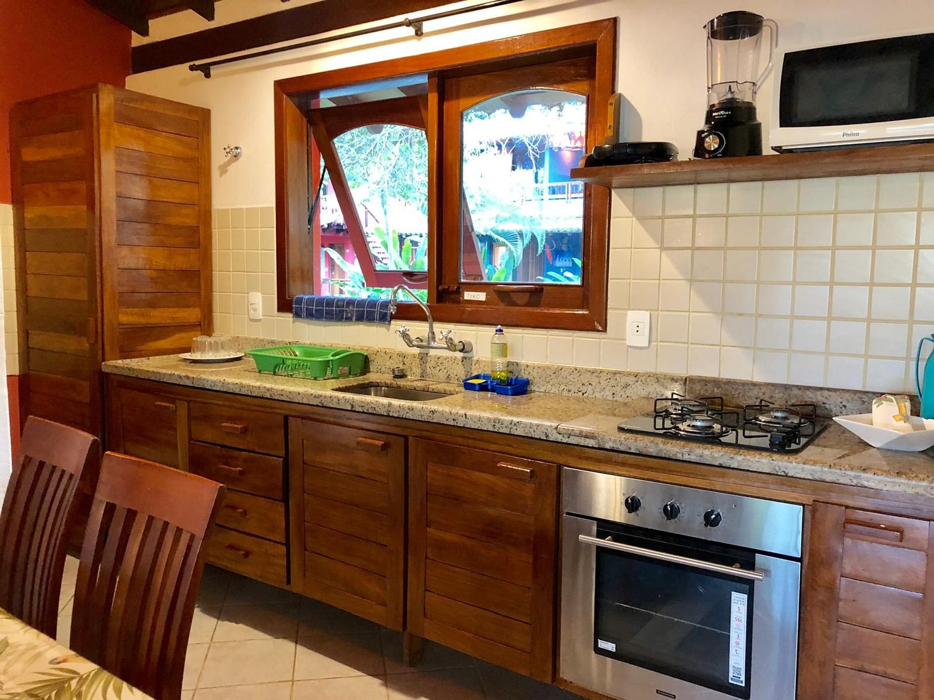 -Cozinha americana bem equipada (forno, fogão, microondas, liquidificador, espremedor, geladeira, sanduicheira, panelas inox, pratos, talheres, ar-condicionado. -Varanda vista jardim com rede, mesa de café e poltronas, -Quarto, com cama Queen size + cama de solteiro com vista para o jardim, ar-condicionado, TV, armario, banheiro, (banheiro ao lado do quarto) -CARACTERÍSTICAS: Acomoda: 04 Pessoas - Quartos: 01– Camas 02 - banheiro social 01